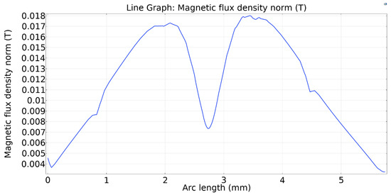 In Equations (6) and (7), is the magnetic vector potential, is the number of turns of the coil of the electromagnet, is the input electrical current to the coil and a and b are the cross-sectional dimensions of the core. The magnetic field density can be calculated from Equation (8), when the external current density is known:
