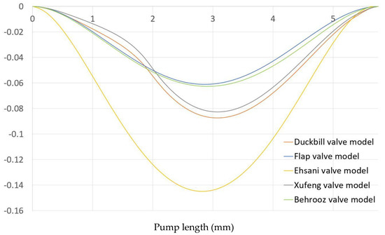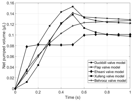 Figure 14 and Table 7 demonstrate the net volume pumped by the five valve models during a 1 s pumping cycle. It is seen clearly from Table 7 that the duckbill valve model has the largest pumping capacity, followed by the flap valve model. It can thus be concluded that the proposed two valve models are superior to the other models in terms of net pumped volume during the same pumping cycle.