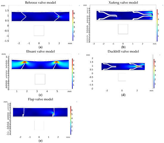 Figure 11 shows that the right valve is fully open when the fluid velocity is maximum at the right outlet, and at the same time, the left valve remains closed to prevent the back flow. This is the same for all five models.