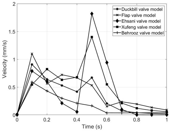 From Table 6 and Figure 12, it is seen that the maximum velocity occurs from 0.1 to 0.5 s for different valve models, which means that the magnetic flux acting on the upper MRE wall rapidly. Among all, the Flap, Duckbill and Behrooz valves have the fastest response time, which is an advantage. In addition, the maximum velocity is obtained for the Ehsani valve model, but has a slower response time. Thus, in terms of rapid deformation of the upper wall, the proposed flap and duckbill valves model show the best performance.