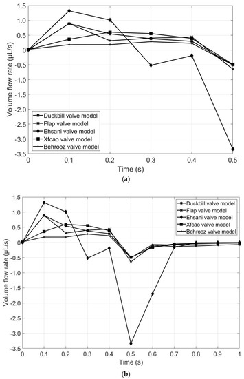 Comparison of volume flow rates for the five valve models: (a) contraction phase (until t = 0.5 s) and (b) both expansion and contraction phase (until t = 1 s).