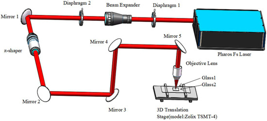 The amplified femtosecond Pharos laser system used for manufacturing porous glass by femtosecond laser welding is sketched in Figure 1. It consisted of a Yb:KGW oscillator and a regenerative amplifier. In our experiments, the system provided pulses at a wavelength of 1030 nm, an average output power of 12 W, a 5-μm-diameter beam spot, and a pulse duration of 1000 fs. The femtosecond laser with a pulse duration of 1000 fs has lower propagation loss [12] and stronger thermal effect accumulation [13], which can facilitate the formation of color center [13] and deeper working depth [14]. We use the high repetition rate ranges from 200 kHz to 2 MHz. In order to investigate the structures of four types of welding spots, the pulse energies were set as 20 μJ, 15 μJ, and 12 μJ, which corresponded to the typical high repetition rates of 600 kHz, 800 kHz, and 1 MHz, respectively. The laser beam was focused by a 20×, 0.4 NA lens onto the interface of two glass substrates (, JGS2, refractive index of 1.45), which was moved by a computer-controlled 3D translation stage (model: Zolix TSMT-4). The Prism-Pro Measuring Instrument was used to measure the refractive index of glass before and after welding. Spatiotemporal beam shaping was performed by a π-shaper beam shaping lens. The welding speed is set to 2 mm/s. Because the welding surface is a square with 30 mm on each side, 15 s are needed to create a welding line in the middle of the surface. To avoid manual errors, we performed each experiment 10 times on average.