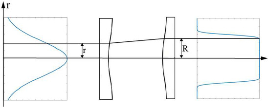 A Gaussian beam can be converted to a flattened Gaussian beam by the use of spatiotemporal beam shaping. Figure 2 shows a π-shaper beam shaping configuration which consists of two plano-aspheric lenses transforming a Gaussian input into a flat-top output intensity distribution with a gradual roll-off from the uniform to null region. The indicated geometric ray mapping then describes where an initial parallel ray with radial distance r is refracted at the first aspherical surface to be redirected in parallel direction with radial distance R at the second aspherical surface [15].