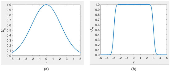(a) Gaussian beam; (b) corresponding flattened Gaussian beam. ( = 3 and (a) N = 0; (b) N = 50).
