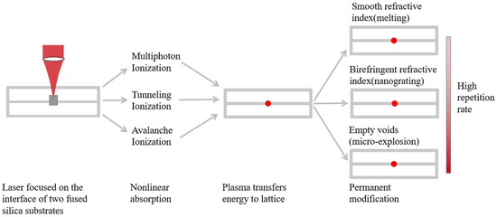 Figure 4 illustrates the three-modification physics of femtosecond laser pulses interacting with fused silica. First, the laser beam is focused on the interface of two fused silica substrates. Then, nonlinear multiphoton ionization, tunneling ionization, and avalanche ionization from absorbed femtosecond laser pulses are responsible for the creation of a free electron plasma. Finally, the plasma transfers its energy to the lattice, resulting in three types of permanent modification: smooth refractive index, birefringent refractive index, and empty voids as the high repetition rate increases [20].
