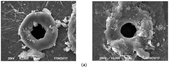 As mentioned in Section 3.1, a Gaussian beam can be converted to a flattened Gaussian beam through spatiotemporal beam shaping. The corresponding flattened Gaussian beam possesses flat bottom characteristics. The energy is more uniformly distributed and concentrated on the focal position with little energy loss. Therefore, the laser energy is sufficient to drill deep pores and partial deep pores, as shown in Figure 5a,b, respectively. A heat-affected zone and oxidization are not apparent for the flattened Gaussian beam, which corresponds to the mechanism in Section 3.1. We can see that the deep pores and partial deep pores in Figure 5a,b have a fair quality of smoother welding edges with little debris. The bottom of the welding spot pore is flat.