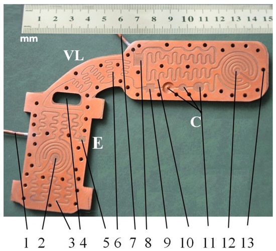 Figure 10 from which the rectangular microchannels used to laminate the R134a coolant were measured. It is immediately obvious that these microchannels are much smaller in width compared with the ones from the condenser and the vaporizer. Due to technological reasons, the height of the rectangular microchannels is the same at the condenser, the lamination tube and the vaporizer, throughout the entire flow path of the coolant.