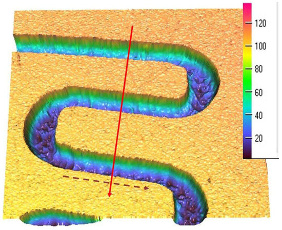 Figure 4 illustrates an example of a transverse profile, highlighting the depth and width of the microchannels. The 2D profile shown in