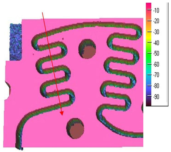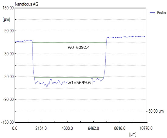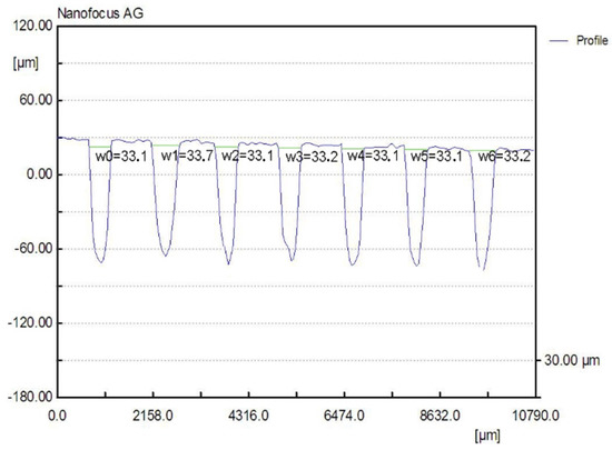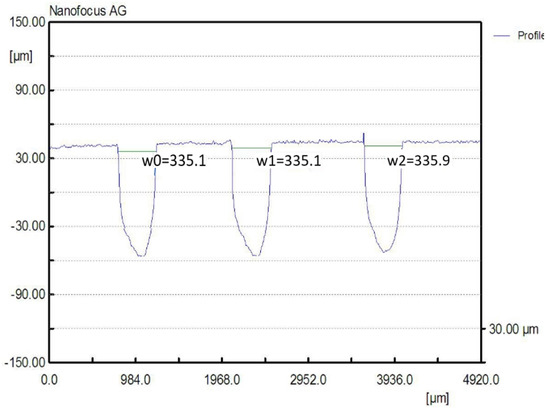 Figure 3. Based on the obtained results, no significant variations were found between the widths of different channels, with the difference amounting to maximum 0.8 µm in width and, respectively, 0.9 µm in depth. The shape of the channels at the base of the microchannels is shown to be different from a rectangular shape due to the limitations of the scanning equipment and image vertical scaling being similar, however, to the ones described in similar research.