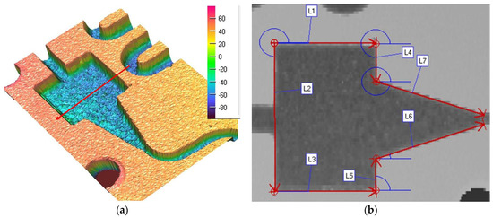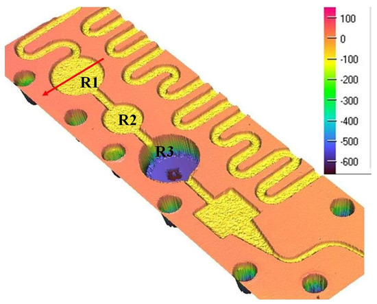 Figure 8a shows a scanned image of the convergent nozzle that ensures the coolant flow from tanks R1–R3 to the lamination microchannel (scale is in μm), and