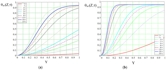 Figure 13a,b, illustrate the evolution of the dimensionless mean temperature obtained by implementing the above described equations in a Mathcad code [