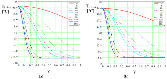 Figure 14a, it is found that the temperature decreases in the center of the vaporizer from an initial value of +21.8 °C to a minimum value of −12.3 °C. If the non-stationary behavior is analyzed in the same figure, it can be observed that after 8 s the coolant temperature drops to −9.8 °C. This confirms that the Joule-Thompson effect followed by expansion in the vaporizer takes place rapidly in the rectangular microchannels, but a strong rarefaction effect also occurs. After 60 s of flowing through the rectangular microchannels, the cooling regime stabilizes, and the curves have the same shape and close values.