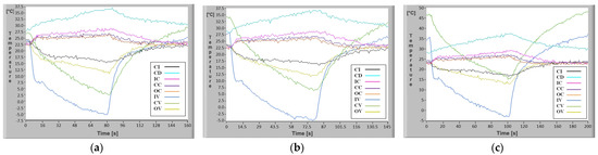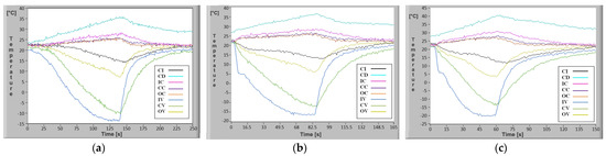 Figure 15b (CV curve), indicate the temperature variation in the central region of the vaporizer independent of time. After 8 s there is a sudden drop in temperature from 21.8 °C to +12 °C, not reaching the −9.8 °C determined theoretically. This can be explained by the inertia of the temperature sensor and the fact that it was not placed inside the rectangular microchannel, but close to it. However, after 69 s when the system is switched off (the stabilized minimum temperature regime has been reached) the temperature value in the experimental case is −11.7 °C compared to the theoretical case when it is −12.3 °C. The temperature difference of 0.5 °C between the results of the mathematical calculations and the experimental values can be explained by losses in the mini refrigeration unit and measurement errors.