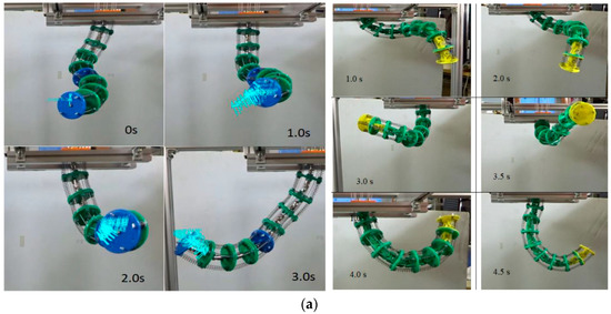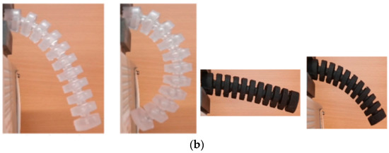 In Figure 4, joints in the macro- and microscales are presented. Specifically, Figure 4a shows the testing of a wire-driven continuum robot arm [124], while Figure 4b experiments with bending deformation due to the applied pressure of an omnidirectional soft pneumatic actuator [94].