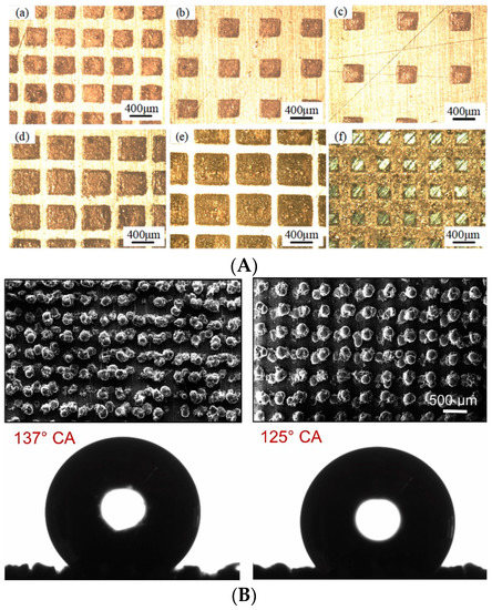 Examples of AM textures. (A) Various textures made of ink-printed copper nanoparticles. Reprinted with permission from Ref. [149]. Copyrights 2019 Elsevier. (B) Two cases of pillar array surfaces and the measured contact angle. Reprinted with permission from Ref. [150]. Copyrights 2021 Elsevier.