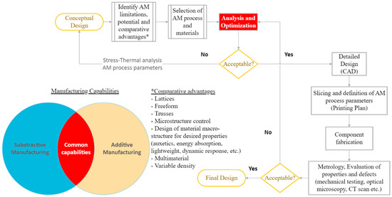 As discussed thoroughly in the previous paragraphs, AM, despite being a revolutionizing fabrication method with unique capabilities, still has limitations and restrictions when it comes to functional component manufacturing. The proposed actions during the process of design for AM are presented in Figure 6.