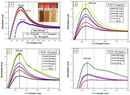 UV–Vis absorption spectra for PVP-AgNPs synthesized using an aqueous extract of Eucalyptus camaldulensis leaves (A) different concentrations of PVP (5, 15 and 50 mg/mL), (B–D) different reduction times at different concentrations of PVP 5, 15 and 50 mg/mL respectively.