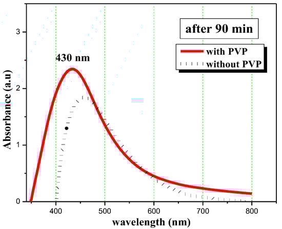 Figure 2 shows a comparison between the absorption spectra of nanosilver prepared by adding PVP (5 mg/mL) and silver nanoparticles prepared according to the method mentioned in our previous work [47] without adding PVP, after 90 min of reaction time. Adding PVP during the preparation process of silver nanoparticles affects the position of SPR peak and thus the size of synthesized nanoparticles and affects the yield of prepared silver nanoparticles which is clear from the intensity of the surface plasmon resonance peak.