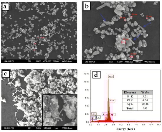 HRSEM images for PVP-AgNPs synthesized using an aqueous extract of Eucalyptus camaldulensis leaves at different concentrations of PVP (a) 5 mg/mL, (b) 15 mg/mL, (c) 50 mg/mL (d) elemental composition of the AgNPs synthesized using EDX detector.