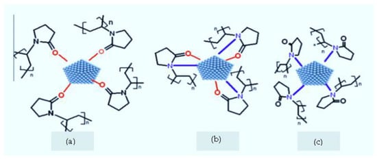 The changes in the FTIR spectrum indicated that PVP protect silver nanoparticles by a coordination bond between nanoparticle and nitrogen and oxygen atoms of PVP. The three possible interactions of the PVP molecule adsorbed onto a silver nanoparticle are illustrated in Figure 5. The first one is interaction between the surface of silver nanoparticles and oxygen only, the second is related to the interaction with both nitrogen and oxygen of PVP, and the third is the possibility whereby nitrogen interacts with silver nanoparticles [49].