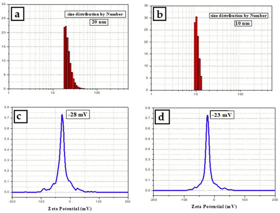The particle size distribution histogarms of silver nanoparticles synthesized with and without adding PVP were shown in Figure 6. The obtained size of PVP-AgNPs was around 20 nm. While the size for silver nanoparticles prepared without PVP was smaller than 10 nm. The presence of PVP as a capping agent surrounds the silver nanoparticles and forms a layer around them which affect the hydrodynamic diameter. By comparing the measured zeta potential values of the prepared silver nanoparticles as Figure 6c,d, we notice that the value for the samples prepared by adding PVP (−28 mV) is higher than those prepared without capping agent (−23 mV). This indicates that the addition of PVP makes the colloidal nanoparticles more stable. A negative value suggests the negatively charged surface of the nanoparticles, which causes an electrostatic repulsion force between the particles and thus increase the stability of the prepared colloidal.