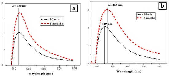 A comparison of Uv-Vis spectra for freshly and after 5 months silver nanoparticles, (a) prepared with PVP, (b) prepared without PVP.
