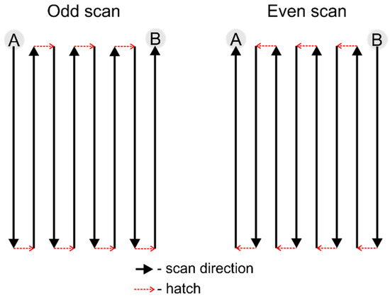 The laser scanning geometry used for cutting the borosilicate glass is presented in Figure 1. Multiple lines were scanned in parallel, separated by the hatch (the distance between two scanned lines). The number of lines in a single scan defined the cut’s width. After each scan, the hatch direction was changed to the opposite. In the case of an odd scan, the scanning started at position A and ended at position B. An even scan started where the odd scan had ended (position B) and returned to position A by following the same scan path backwards.