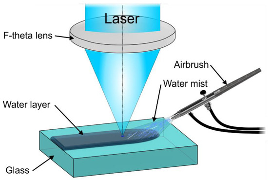 A thin flowing water film was formed at the surface of the glass workpiece by spraying water mist (see Figure 2). The mist was formed with a commercially available airbrush connected to a pressurised air (3 bar). Here, high-velocity air atomised water into droplets which then were sprayed onto the glass surface and formed a liquid film flowing through the laser ablation zone. The liquid layer was the thickest at the beginning and gradually thinned out as the distance from the nozzle tip increased. In this study, the liquid film flow direction was parallel to the laser scanning direction. At the start of the cut line, the thickness of the liquid layer was 750 µm, whereas at the end of the cut line (26 mm away), the thickness decreased to 450 µm. Variation in layer thickness had no significant effect on ablation efficiency over the length of the cut.