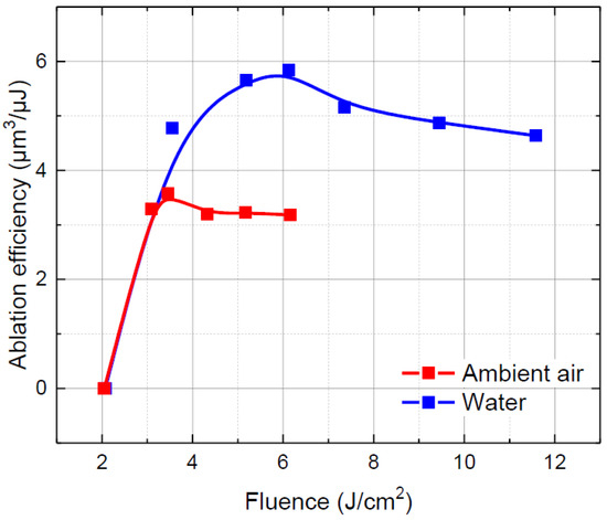 First, the laser fluence was optimised in both environments. The laser fluence was varied from 2 to 12 J/cm2 by changing the laser pulse energy. The results are presented in Figure 4. The shapes of both ablation efficiency curves were similar, despite different ablation environments. However, the peak of the ablation efficiency curve in water was higher by 63.6% (3.57 versus 5.84 µm3/µJ) and shifted towards higher fluencies (from 3.5 J/cm2 to 6.1 J/cm2).