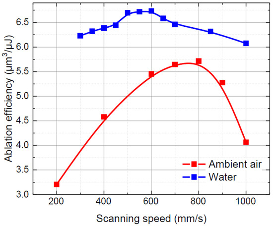 Then, the laser beam scanning speed was varied from 200 to 1000 mm/s (see Figure 5). Glass ablation in water remained more efficient in the investigated scanning speed range. Additionally, varying the scanning speed outside the optimal values in water was not as detrimental as in ambient air. The optimal laser beam scanning speed for glass ablation in water was lower (600 mm/s) compared with ablation in ambient air (800 mm/s). Here, the difference in the optimal scanning speed was determined by the different pulse repetition rates in both environments.