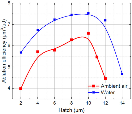 Finally, a hatch distance was optimised. The distance between the scan lines was varied between 2 and 14 µm to find an optimal hatch value. Additionally, the number of parallel cut lines was adjusted to maintain a constant cut width. Ablation efficiency dependence on the hatch distance is presented in Figure 6. Here, the peak efficiency was obtained at the same hatch distance (10 µm) in both environments, which indicated that the hatch distance mostly depended on the laser beam spot size, but not on the processing environment. At a 10 µm hatch distance, the laser ablation efficiency in ambient air was 6.6 µm3/µJ. The ablation efficiency in water was 14% higher, reaching 7.5 µm3/µJ.