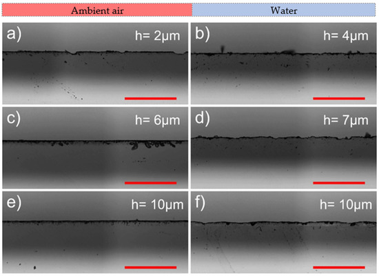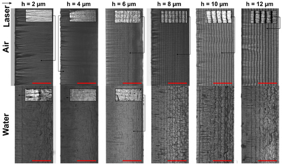 Additionally, we observed vertical cracks formed at the cut sidewall normal to the glass surface (a network of cracks spanned between the front and the back surfaces, as shown in the insets in Figure 7). Cracks were more visible on cut sidewalls produced in ambient air due to a much smoother cut wall surface (see insets at h = 2, 6, 8, 10, and 12 µm). In the case of cutting in water, a network of vertical cracks was visible in smoother areas of the sidewall where surface distortion was minimal. Here, cracks were clearly visible at h = 2, 4, and 6 µm. The melting was more pronounced in distorted areas of the cut sidewall. Thus, the network of cracks could have been covered with re-solidified melt, hindering their detectability [52]. However, we could not identify cracks in distorted areas in the micrographs presented in Figure 7.