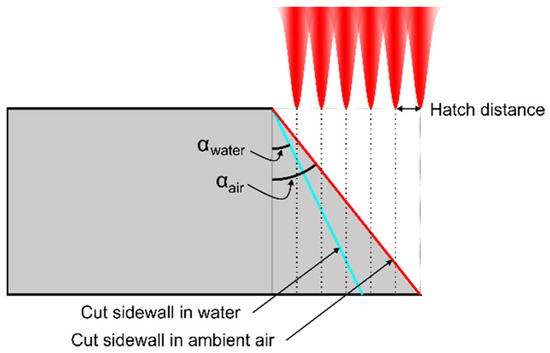 In the experiments, we used a Gaussian laser beam intensity profile. Thus, these formations resulted from the cumulative beam intensity distribution projected onto the glass plate after multiple laser scans (Figure 8). The accumulated laser intensity distribution (the distance between intensity minimums and maximums) depended on the hatch distance between individual cut lines. Concavities represent the laser beam intensity peaks, where more material was removed. In Figure 8, dashed lines (normal to the glass plate surface) were extrapolated from the laser intensity peaks to the inclined cut sidewall, indicating positions where concavities would be formed. Ridges were formed in intensity minimums between the cut lines, thus removing less material. However, as the hatch distance decreased to 2 µm in ambient air and 4 µm in water, the ridges became indistinguishable to the eye. Hatch became comparable to the pitch, yielding a relatively uniform overlap in both directions.