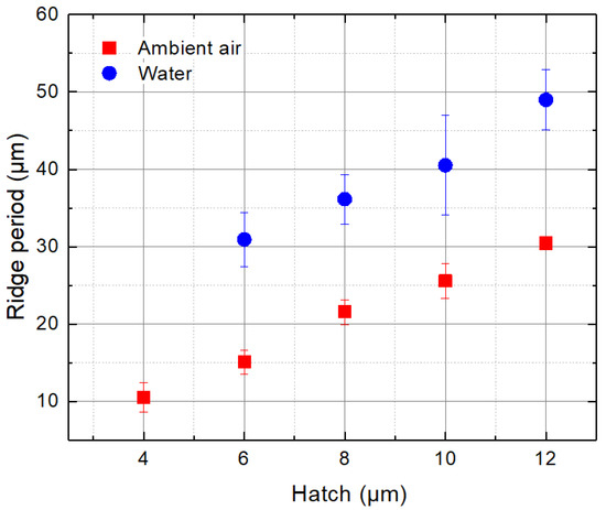 The period of ridges H depended on the hatch distance and the cut wall taper angle: (see Figure 8), where α is the taper angle obtained in water (αwater) or in ambient air (αair). According to the measurements, the average taper angle in water was 16°, whereas the angle in ambient air was larger—23.4°. As a result, fewer ridges were projected on glass strips that were cut in water, resulting in larger ridge periods. The period of ridges versus the hatch distance is presented in Figure 9. At h = 6 µm, the ridge period in ambient air was 15.1 µm, whereas in water, it was almost two times larger (30.9 µm). The ridge period increased more quickly in water with the hatch. As a result, the difference in periods gradually increased to almost 20 µm at h = 12 µm.
