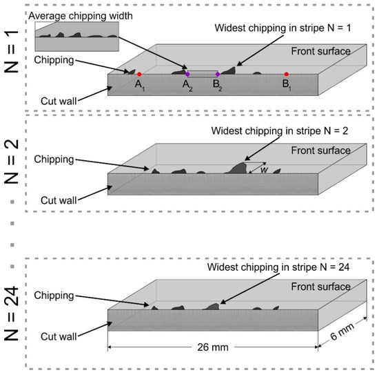 A total of 48 strips were cut for every preselected hatch (24 in ambient air and 24 in water). Each strip was cut with two laser cuts along the longer edge of the glass plate. This way, four cut edges were inspected per single glass strip—two edges at the front and two at the back surface of each strip.