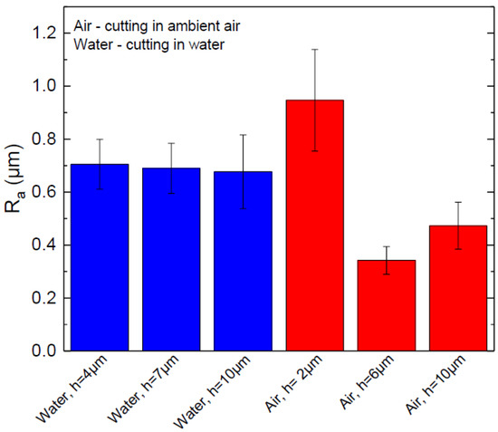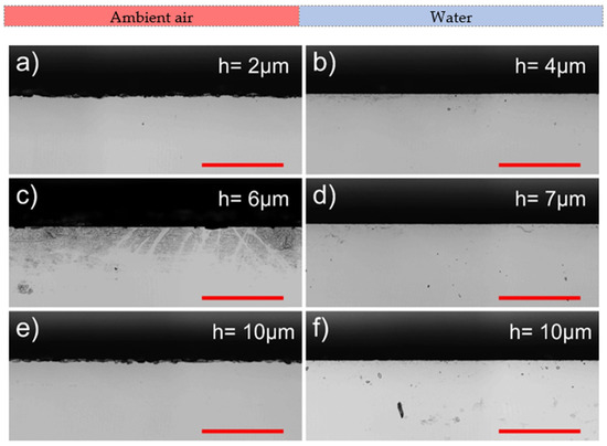 The most noticeable difference in cut edge quality between the two environments was observed at the front surface of the laser-cut glass strips (see Figure 11). Cutting in water was superior to cutting in ambient air in terms of cut edge quality. The average chipping width in water was 7.2 ± 1.2 times smaller than in air (see Table 2). Furthermore, variation in hatch distance in the water had an insignificant effect on the average chipping width, which was distributed between 0.75 and 0.85 µm. Here, the smallest value of 0.75 ± 0.35 µm was observed at the optimal hatch distance (h = 10 µm).