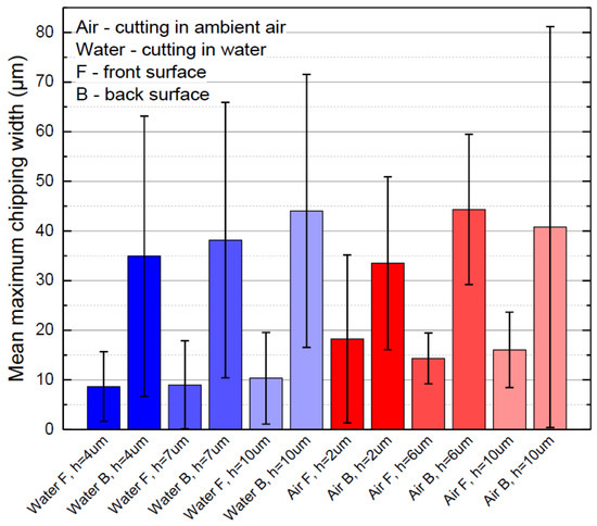 Next, we evaluated the mean maximum chipping widths at the back and the front surfaces. The formation of wide chippings that were significantly wider than the average chipping width was scarce. However, this could not be avoided entirely, even when cutting under optimal laser processing parameters. The mean maximum chipping width at the back surface was distributed between 34 and 44 µm in both cutting environments, with the smallest widths at h = 2–4 µm (see Figure 13). At the front surface, maximum chipping was smaller in water by 43% (9.3 ± 0.9 µm in water and 16.2 ± 2 µm in ambient air). Furthermore, error bars in Figure 13 reveal that the mean maximum chipping width was more consistent at the front surface than at the back.