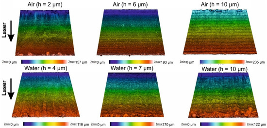 A rougher sidewall could indicate the presence of larger defects which negatively affect the strength of glass strips [17]. For this reason, we studied the roughness of laser-cut sidewalls produced in ambient air and water at preselected hatch values (optimal, ridge-free and intermediate). Recorded 3D topologies at different h values are depicted in Figure 14.