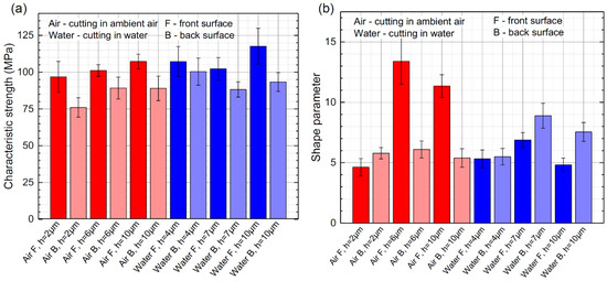 In the case of cutting in water, the cut sidewall surface roughness remained constant regardless of the hatch and should not affect the strength of glass strips differently in the investigated h range. The mean maximum chipping width decreased with the hatch; therefore, the change in the characteristic strength at the front side of the strips could only be supported by the increase in average chipping width. In the case of back side strength, the maximum value was obtained at the smallest hatch value of 2 µm and was supported with the decrease in average and mean maximum chipping widths.
