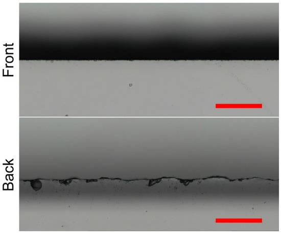 Optical micrographs showing front and back surface cut edges. Cutting was performed in water at 15.5 W. The scale bars represent 200 μm and apply to all panels in the figure.