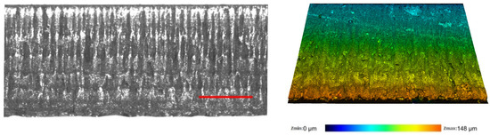 Optical micrograph (left) and the topography (right) of the cut sidewall produced in water at 15.5 W. The scale bar in the left panel represents 200 µm.
