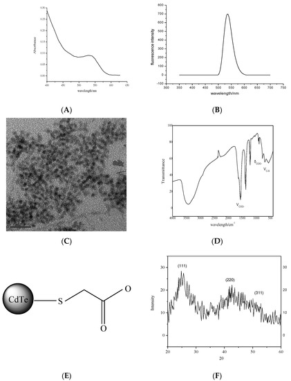 The UV–visible spectrum (UV/Vis-265) was obtained for CdTe QDs by regulating the concentration of quantum dots at 1.0 × 10−4 mol/L, in the wavelength range of 800–200 nm, and the absorption spectrum was determined by quartz cuvette absorbance.