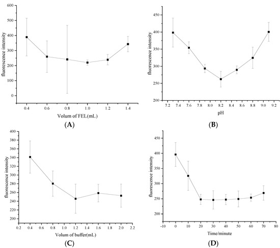 Figure 4C, the fluorescence quenching degree increased with the increase in the dosage of buffer solution, and the fluorescence quenching degree was strong and stable with a dosage of 1.2–2.0 mL. When 1.5 mL of buffer solution was used in the experiment, the fluorescence intensity was 258.708 ± 0.02003 (