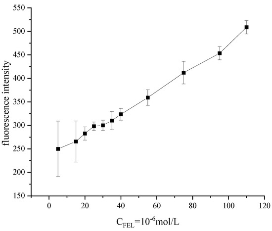 The standard curve of FEL was determined under the optimal synthesis conditions of CdTe quantum dots and reaction of CdTe quantum dots with FEL. The linear equation is Y = 3.9448x + 50.068, the correlation coefficient R2 is 0.9986, and the linear range is 5 × 10