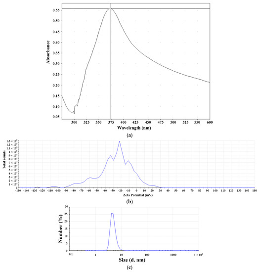 - Absorption peak: The instrument will emit UV and visible light to radiate the object under analysis. Through the sensor receiving the light, it can measure the absorption peak of each wavelength of the colloid. Higher absorption peaks suggest higher concentrations of colloid at the wavelength. On the contrary, a lower absorption rate suggests a lower concentration of colloid [33,34,35].