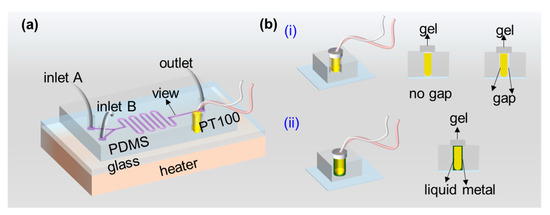 It is hard to make a Pt resistance sensor repeatedly be placed closely in a giant hole, which should affect the accuracy of the feedback signal. In order to ensure that the sensitive elements of the sensor are entirely in contact with the top surface of the glass slide, meanwhile, away from the PDMS block, liquid metal with high thermal conductivity and flexibility is used to fill the gap between the cylindrical hole and the Pt resistance sensor. In this way, the measurement accuracy of the sensor gets significant improvement. As shown in the double y-axis plot in Figure 4a, when the hole is, the temperature distribution of the sensor has become uniform with liquid metal filled in the gap, and the steady-state temperature is higher than that of air that exists. When the steady-state temperature is reached, the average measured temperature difference between the filled liquid metal and air medium is about 0.5 °C, which is five times the allowable error.