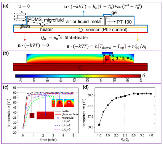 (a) Boundary condition settings of the microfluidic heating system. (b) The temperature field of the microfluidic heating system. Here the target temperature is 60 °C and d1/d2 = 2. (c) The real-time temperature of the heater, glass, and microfluid with different hole sizes. Here the heating power is 30 W. (d) The experimental steady-state temperature as a function of d1/d2.