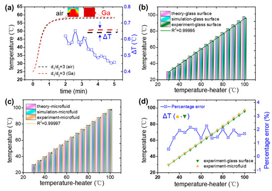 (a) The temperature (left y-axis) and temperature difference (right y-axis) as a function of time, with the condition of with and without liquid metal filled in the gap. Here d1/d2 = 3. The theoretical, simulated, and experimental temperature of glass surface (b) and microfluid (c) with the set temperature in a range of 30–100 °C. (d) The comparison of experimental temperature between the glass surface and microfluid. Here the average temperature error is 1.74%.