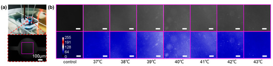 The average surface grey level of each picture is calculated, which is used to represent the fluorescence intensity. Each picture contains 20,736 pixels. The distribution of surface grey levels (0–255) at different temperatures is shown in Figure 6a. It can be seen that the grey level of the control group is the smallest and most concentrated. The rest of the distribution is also obviously discriminative at each temperature, and it shows a trend of first increasing and then decreasing. In order to further quantify the raw data, the weighted average of each grey band is calculated, as shown in the black curve of Figure 6b. The grey level reaches the maximum at 40 °C, and it has a slight distinction at 39–40 °C. Three experiments were performed to verify the reliability of this measurement method. The percentage increase in the average fluorescence intensity of the fluorescence group relative to the control was calculated as shown in the blue curve in Figure 6b.