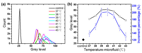 (a) Probability distribution of grey scales from 0 to 255. (b) Weighted average grey level of each image and increment percentage to control group against the different temperatures of microfluid.